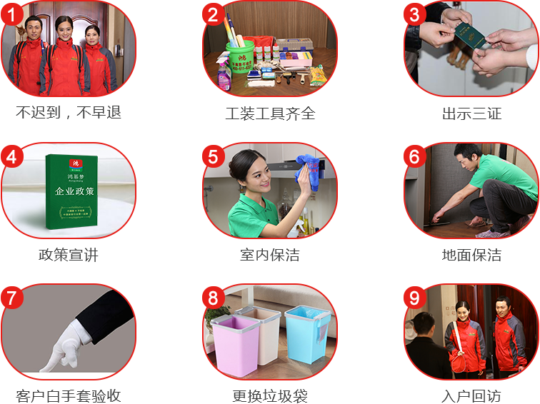 1.窗明幾凈:提供服務提交后屋子里干干凈凈敞亮 2.干干凈的凈:服務保障完全后沒有的殘垢、有塵、其它雜物 3.井然秩序:化學品擺設雜亂,布局打掃房間便于